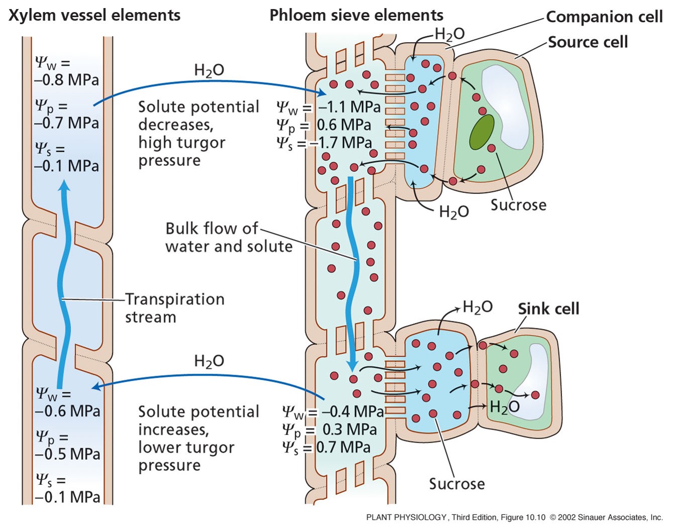 In the phloem of a source leaf, the water potential is typically more negativethan it is in the phloem of the sink. In this case, water transport is drivenby a difference in hydrostatic pressure, and water moves up a gradient in waterpotential.