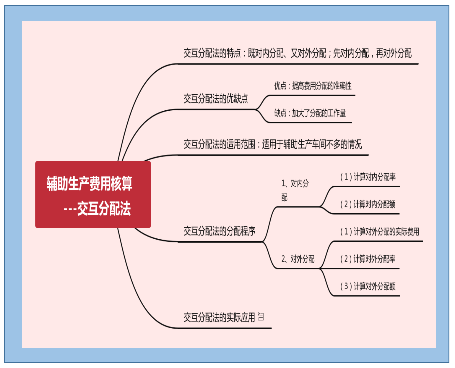 1、熟悉辅助生产费用核算的内容; 2、理解交互分配法的分配原理与流程 ; 3、掌握辅助生产费用交互分配法的应用; 4、能正确使用交互分配法完成辅助生产费用核算; 5、能发现企业辅助生产车间存在的问题并提出控制措施; 6、养成诚实守信、爱岗敬业、客观公正、坚持准则的职业道德。 |