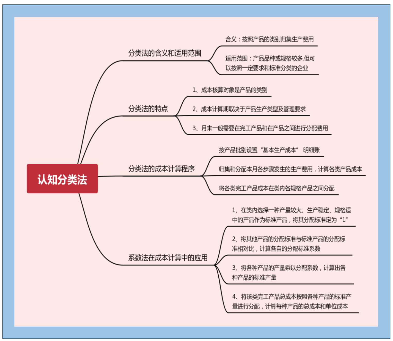 1、了解分类法的含义、特点; 2、熟悉分类法的适用范围; 3、掌握分类法的核算流程、系数法的应用程序; 4、能根据企业实际情况正确选择将完工产品成本在类别内分配的标准; 5、能正确设置成本核算相关账户; 6、养成诚实守信、勤俭节约、爱岗敬业、精益求精、客观公正、坚持准则的职业道德。 |