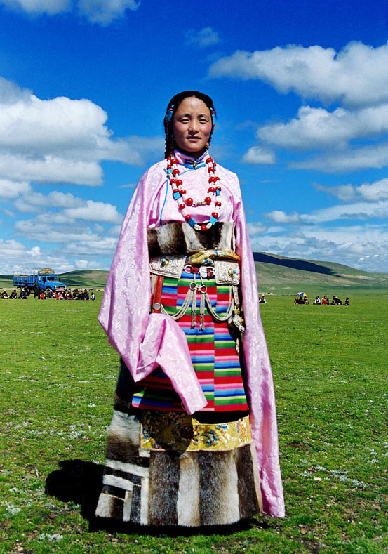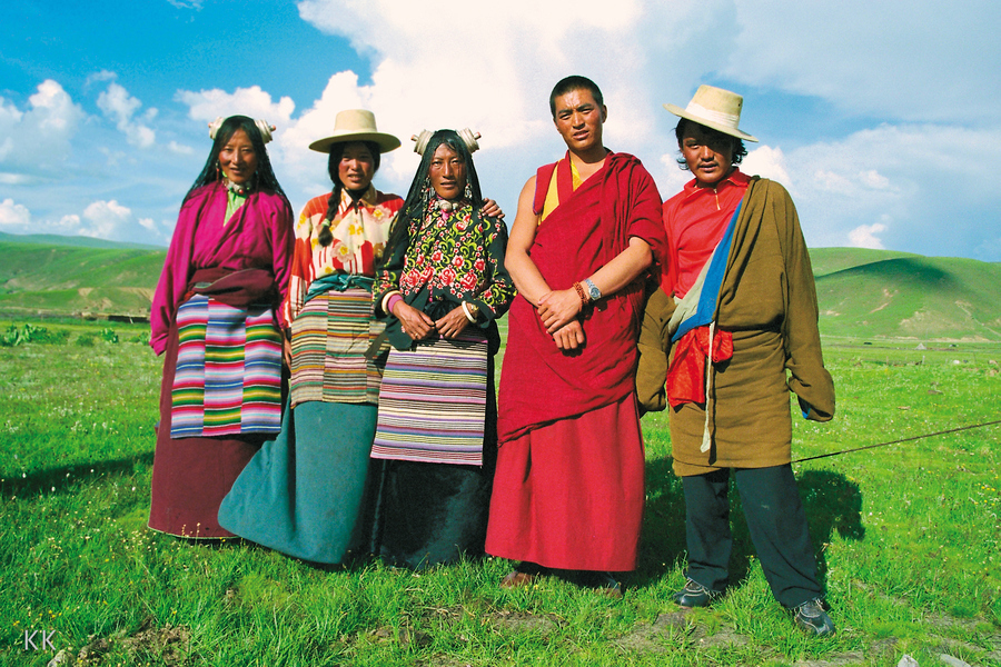 In general the Zang men wear plaits on the head and women wear them on the shoulders. They all wear gowns with long sleeves. When they are dancing, their sleeves look wings flapping in the air. The monks wear cassocks whose colors vary according to their particular sect of Tibetan Buddhism.