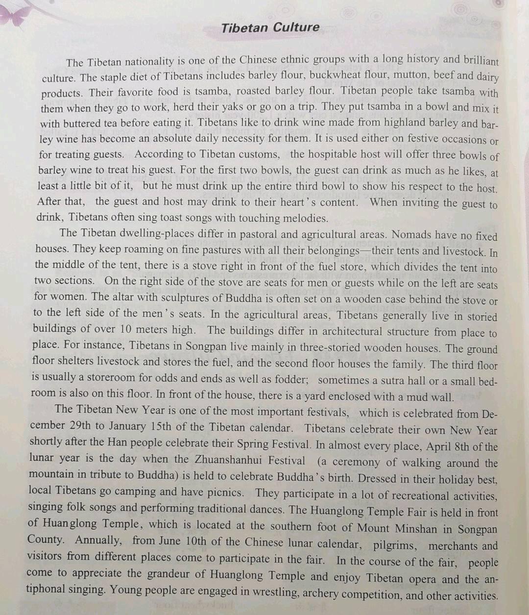 The most important festival in the calendar is the first day of the Tibetan New Year. They clean their rooms in preparation for that day, paint symbols of auspice, and warmly greet each other in the morning. On the fifteenth day, they attend the Butter Lamp Festival. Another festival, the Saka Dawa Festival falls on the fifteenth day of the fourth month, and celebrates the birth of Sakyamuni and the arrival of Princess Wencheng. This festival involves a wide range of activities. On the Shoton Festival, the first day of the seventh Tibetan month, they take pots and wares to enjoy tea, yogurt and yak butter tea in a scenic place. The Great Prayer Festival and The Bathing Festival are also important festivals. If you are a guest in Tibet, the Zang people may give you a gift of a 'hada', a kind of white ribbon. This represents their warmest heart.