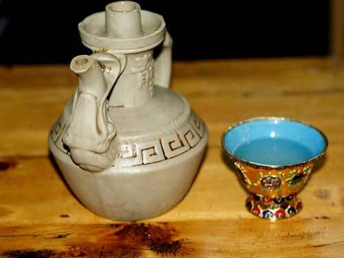 Usually the Zang people eat three meals a day, but during the busy harvest season they will have four, five and often more. Their staple foods are tsamba, yak butter tea, mutton, and beef. Tsamba, made of highland wheat (Qingke) is convenient to carry around and eat whenever you want, so you can see many of them carrying tsamba bags. As for drinks, they enjoy chang, a type of wine also made from Qingke, and milk tea. The Tibetan knife, sharp and delicate, is often used to cut meat.