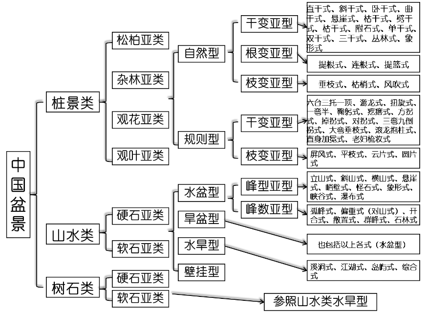 只有树桩盆景的分类,没有山水盆景分类,在树桩盆景中根据造型样式分为若干式。