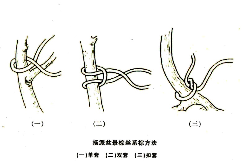 ⑥靠棕法:在枝条的叉枝上,为防止叉枝因剪扎而撕裂的一种棕法。先在一枝上套上棕,交叉一下后,在另一枝外侧收紧打结,使两枝稍稍靠拢,这样下一步弯曲枝条时,丫杈处不会撕裂。