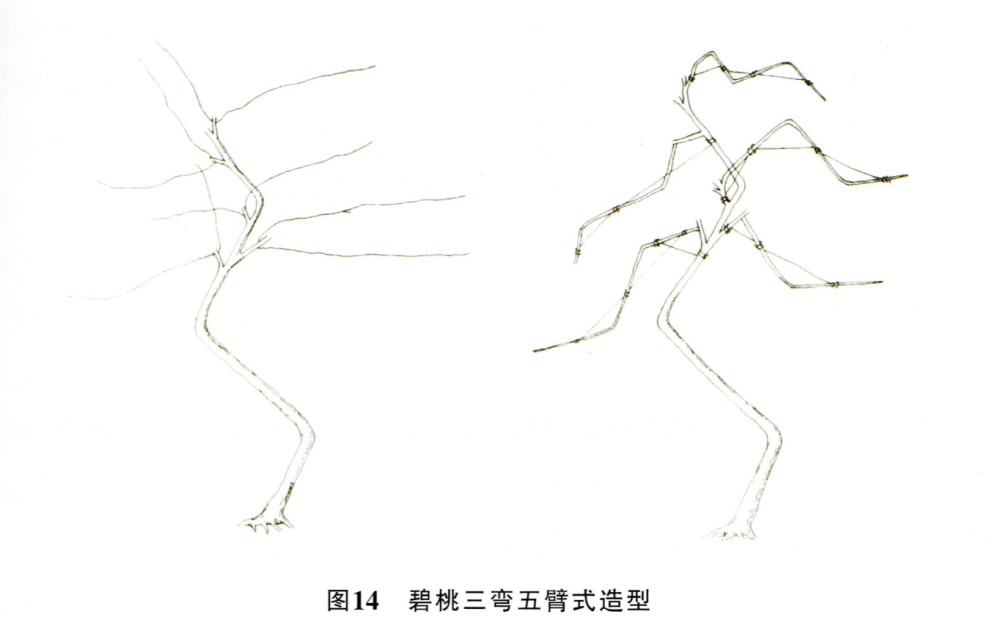 碧桃三弯五臂式剪扎多在春分前,选用二年生苗斜栽于盆中,然后应用11种棕法,按三弯五臂式造型(图14),待放叶后,移至室外进行养护管理,秋末见蕾后,再进行复条,春节前50-70天进房烘晒(保持室温15℃),届时即可放花赏玩。
