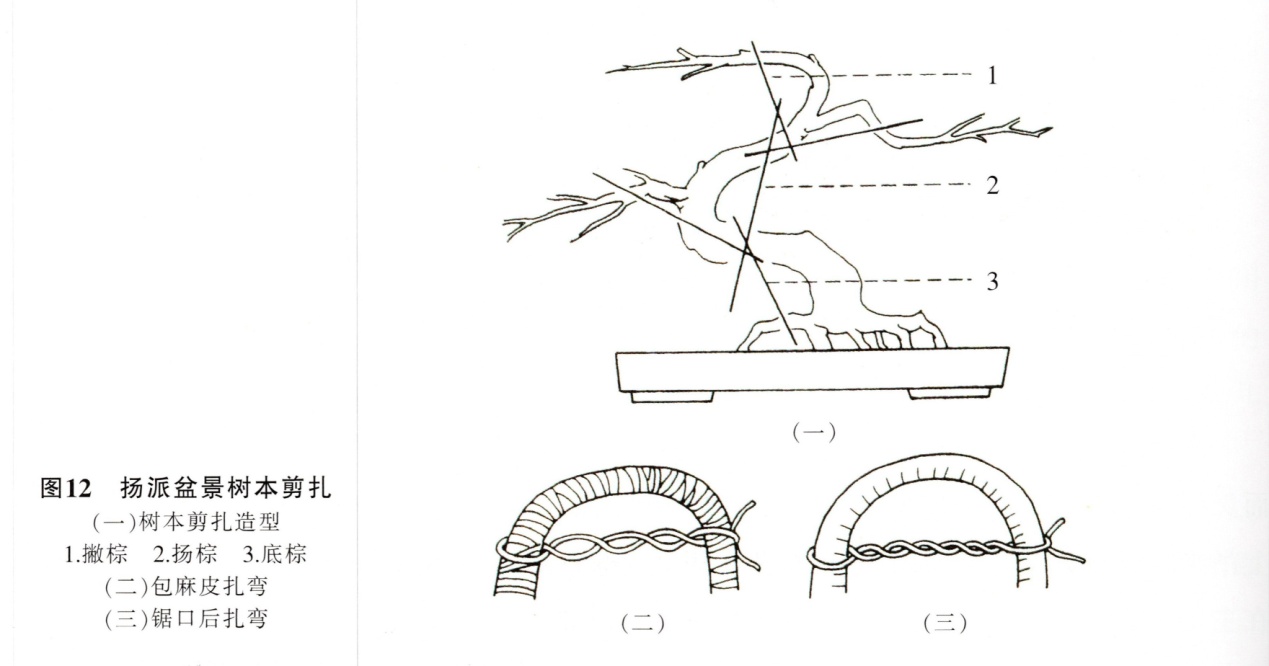 树本造型剪扎时,将精心选择的树本斜靠在盆口,第一棕用棕线,应用扣套法,尽量扎在主干贴近土面的位置,以使主干下部就近弯曲,然后用底棕法活结扎第一弯,调节棕线松紧,待弯曲状态达到理想时,系成死结,剪去余棕;然后应用扬棕法、底棕法、撇棕法,扎成第二弯、第三弯……弯曲角度大小、方向,一靠创作立意,二靠手腕功底。需造型者功底深厚,应用自如,否则一不小心则易折断树干。倘若树干较粗或较脆,为防止折断,先在需要弯曲部位缠上麻皮或布条,然后进行弯曲;亦可在需要弯曲的树干或主枝的内侧,用小锯拉几道小口,深度不可超过树干直径的三分之一,然后扎弯。