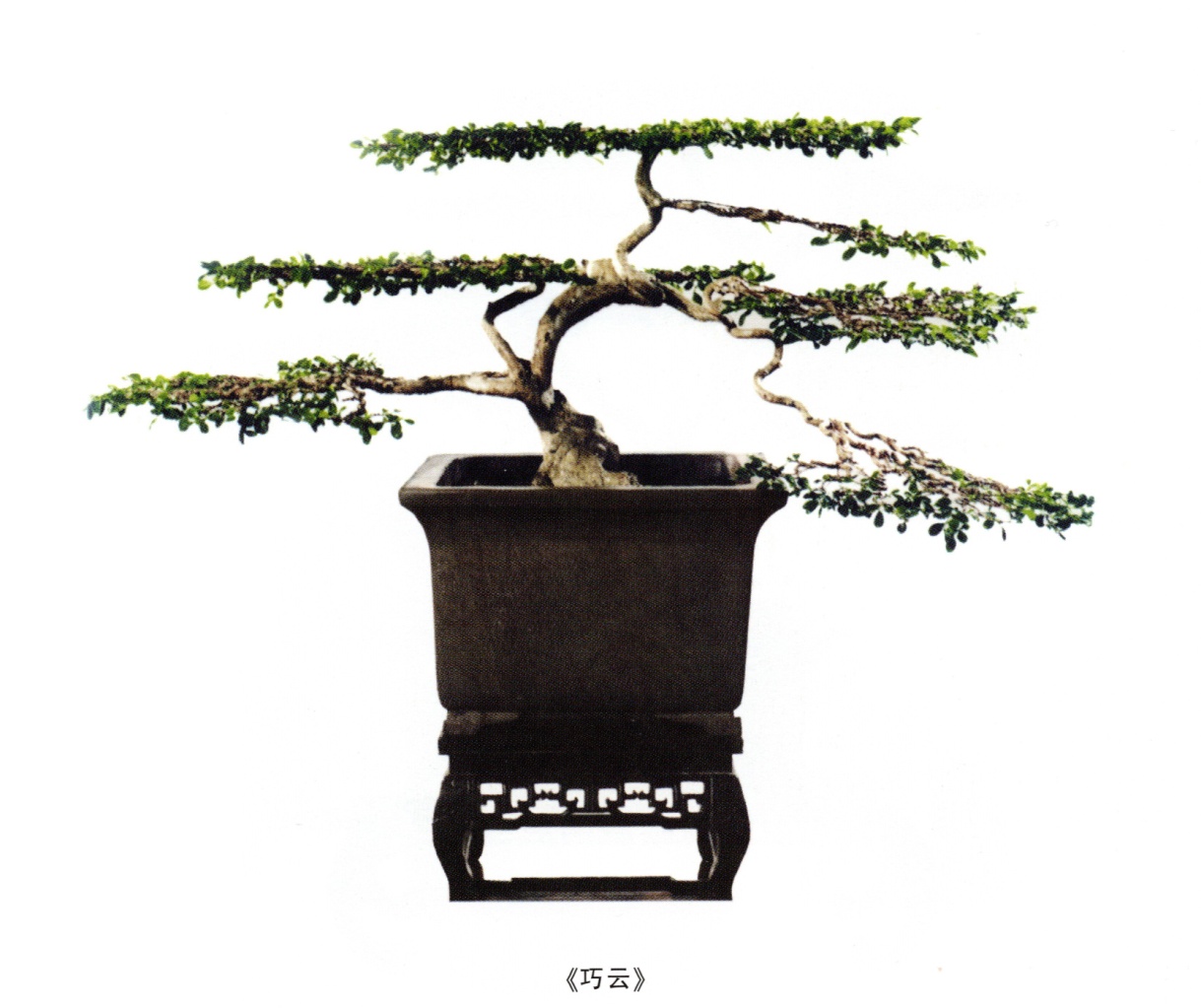 (4)枝叶扎片:扎片形式万变不离其宗,多为“云片”,如同飘浮在蓝天中极薄的云朵。其中,以观叶类的黄杨(瓜子黄杨)、桧柏、紫衫、榆树、银杏等品种尤为突出。一般顶片为圆形,中下片多为掌形。“云片”多寡视其创作立意、植株大小、造型形式而定,为1-9片。1-2层称“台式”,多层称“巧云”(图13)。小者如碗口,大者如缸口。