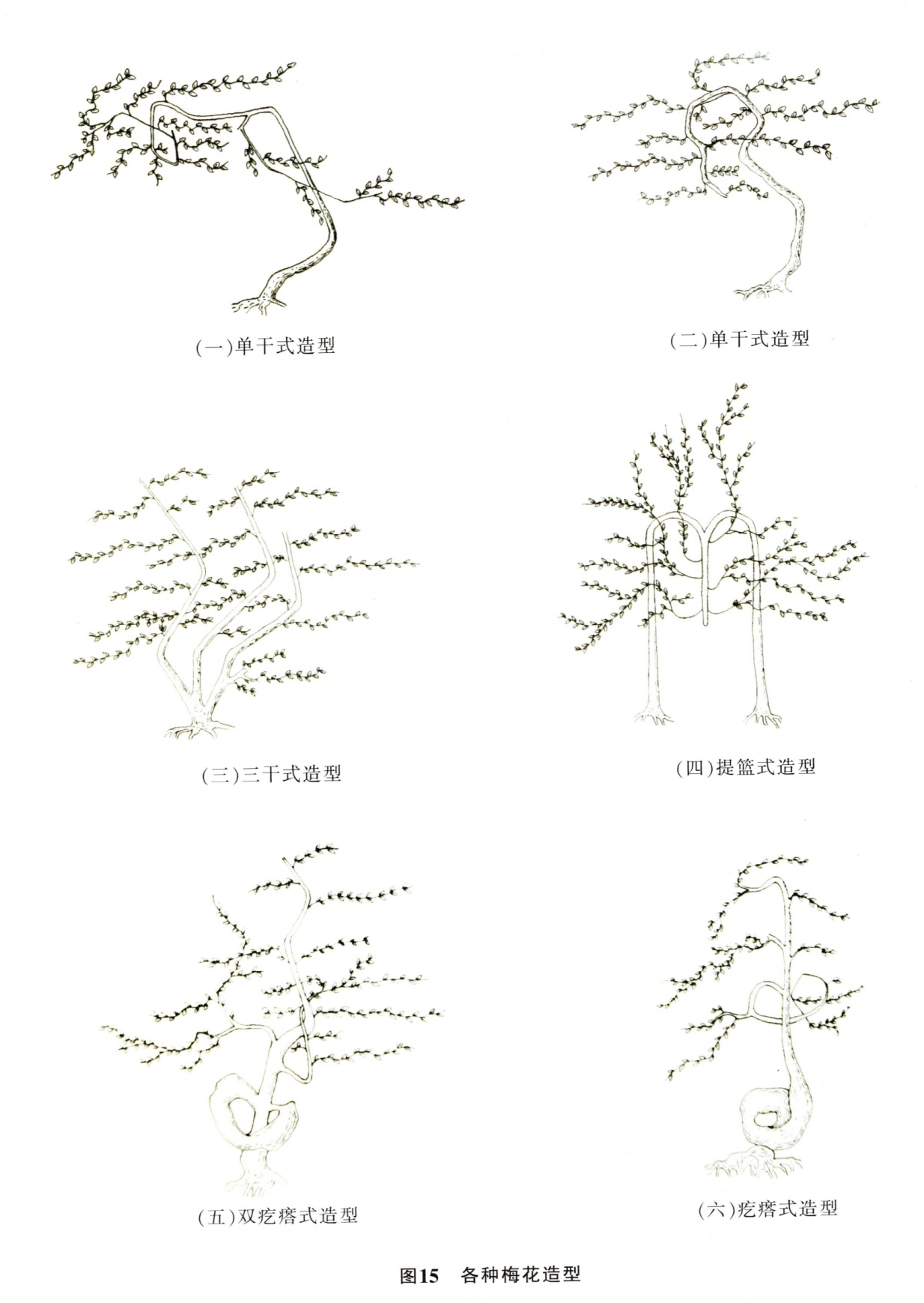 梅花单干式、三干式、疙瘩式、提篮式剪扎(图15),多在春分前将梅胚应用11种棕法,按上述形式进行造型,待放叶后,移至室外养护管理,入梅时进行复条(此时枝条柔软),春节前15天进房烘晒(保持室温15℃),届时即可放花赏玩。