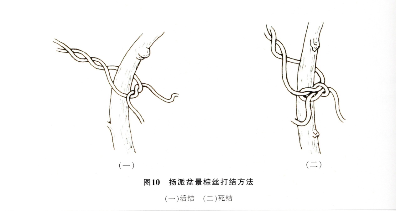 ①活结:弯曲树干或枝条时,系棕后每弯先打活结,便于调节各弯松紧,待树干或枝条弯曲达到理想弯度,然后将各活结打成死结。