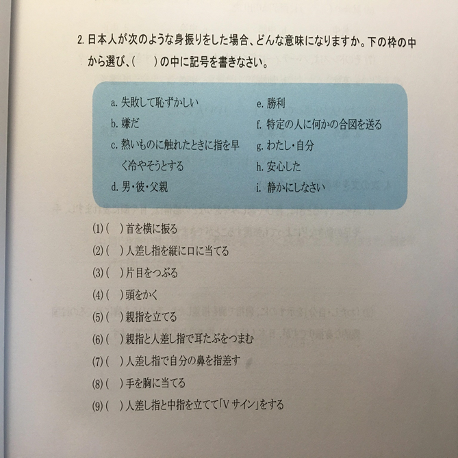 けれども、同じ身振りでも、国や民族によって意味が違う場合があります。例えば、「親指を立てる」のは、多くの国では「オーケー、よい、最高だ」という意味を表しますが、日本では「男、彼、父親」などを表します。息子が友人に親指を立てて「これにどなられた」と言えば、「父親に大きな声で叱られた」ということです。また、「親指と人差し指で耳たぶをつまむ」のは、ほとんどのアジア諸国やアメリカ合衆国などでは「よく聞きなさい」とか、あるいは「聞こえない」など、聞くことに関係のある身振りですが、日本や韓国では、熱い物に触れた時に指を早く冷やそうとする動作です。