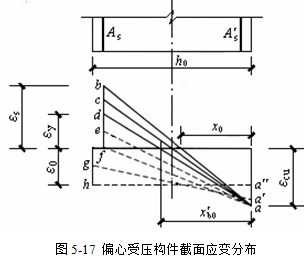 从截面的应变分布分析(图5-17),要保证受拉钢筋先达屈服强度,相对受压区高度必须满足ξ<ξb的条件。ξb的取值与受弯构件正截面承载能力分析的相同。尽管截面配筋率变化和偏心距变化会影响破坏形态,但只要相对受压区高度满足上述条件都为大偏心受压破坏,否则为小偏心受压破坏。