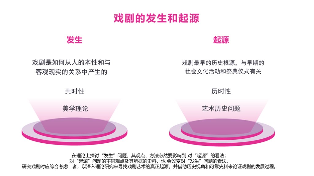 讲“发生”,是从人的本性以及人与客观现实的关系,来探讨戏剧这一艺术现象是如何产生的;讲“起源”,则是从人的社会文化活动的实践,去寻找这一艺术现象最早的历史源头。