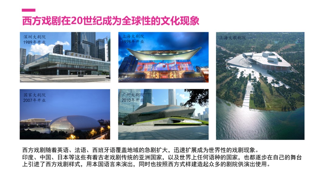 随着欧洲在东方殖民地域的扩张,以及西方文化的东渐,西方戏剧也向东方不断渗透,蔓延到了非洲、亚洲,一直到大洋洲的广大地界。也可以说,西方戏剧随着英语、法语、西班牙语覆盖地域的急剧扩大,迅速扩展成为世界性的戏剧现象。而印度、中国、日本等这些有着古老戏剧传统的亚洲国家,以及世界上任何语种的国家,也都逐步在自己的舞台上引进了西方戏剧样式,用本国语言来演出,同时也按照西方式样建造起众多的剧院供演出使用。于是西方戏剧在20世纪成为全球性的文化现象。