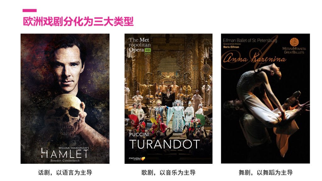 文艺思潮的模仿原则和趋实原则,奠定了欧洲戏剧分化为三大类型的哲学和美学的基础。这三大类型为话剧、歌剧和舞剧,分别以语言、音乐和舞蹈为主导性的舞台表现方式,不同于东方古老戏剧综合融会的舞台原则。东西方戏剧由此分途。西方戏剧又以话剧为主导样式,它为人类贡献了丰富的人文和文学瑰宝,以写实性的舞台方式区别于东方传统的写意性戏剧。