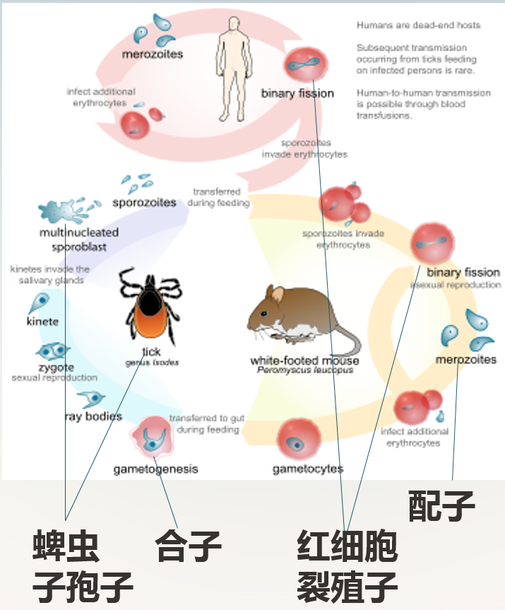 孢子生殖:合子多次分裂进入蜱卵母细胞内,产生大量的子孢子,随蜱唾液主脾卵传播。