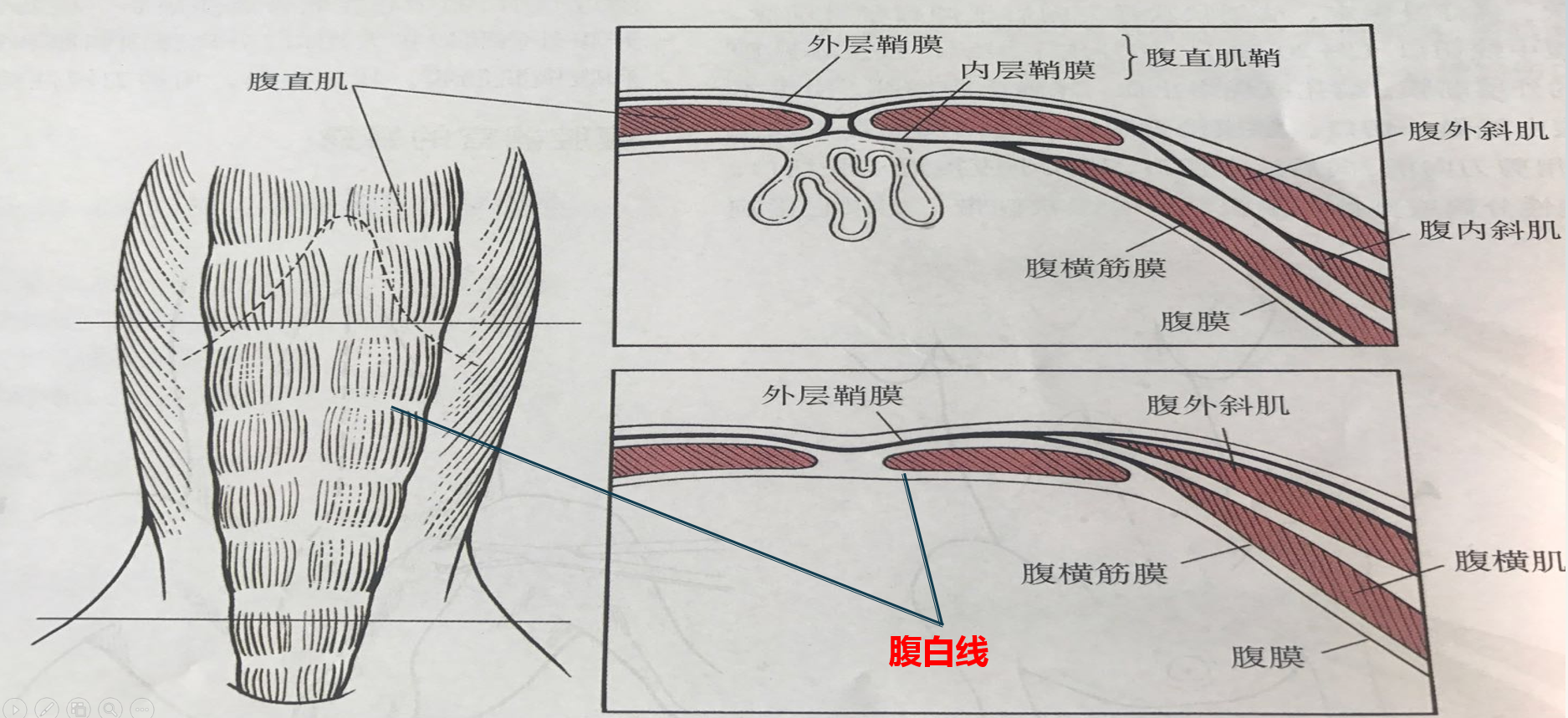 腹白线:腹底壁自剑状软骨至耻骨前缘两侧腹直肌鞘膜于腹正中线相互交织而成的白色腱膜。血管分布少,常为开腹的通路。