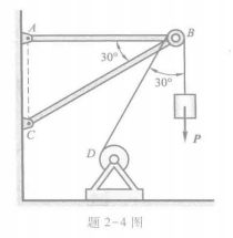 2-4 物体重P=20kN,用绳子挂在支架的滑轮B上,绳子的另一端接在绞车D上,如图所示。转动绞车,物体便能升起。设滑轮的大小、杆AB与BC自重、及滑轮轴承处摩擦略去不计,A、B、C三处均为饺链连接。当物体处于平衡状态时,求杆AB与BC所受的力。