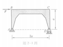 2-1 图示刚架的点B作用一水平力F,刚架重量略去不计。求支座A,D处的约束力,