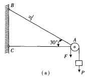 2-16 简易起重设备的计算简图如图所示。已知斜杆AB用两根63mm×40mm×4mm不等边角钢组成,钢的许用应力[σ]=I70MPa。当提起重量为P=15kN的重物时,试校核斜杆AB的强度。
