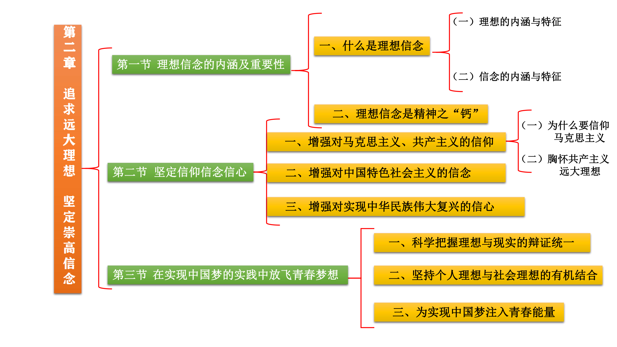 本章主要讲授的是新时代大学生应坚定理想信念,自觉把个人理想追求融入实现中华民族伟大复兴中国梦的奋斗当中。大一新生正处在原来的奋斗目标已经基本实现、新的目标还未完全确立的关键时期,理想信念教育对于解决学生理想信念不够坚定、学习方向不够明确和学习动力不够充足的问题有着重要的实践意义。本章的教学内容遵循了“从思想到行为”的逻辑结构,即通过对理想信念的内涵和特征等理论知识的建构到树立科学的理想信念等思想意识的确立、探讨理想变为现实的途径和方法等实践行动的指导。