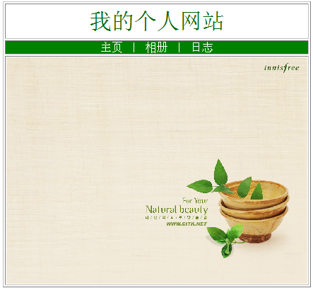 <tr><tdbgcolor="#008000"><palign="center"><fontcolor="#FFFFFF">主页|相册|日志</font></td></tr>