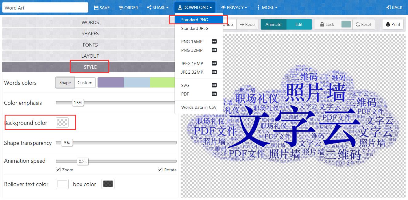文字云的背景色变成灰白马赛克。保存图片时必须选择“Standard PNG”。因为JPEG格式的图片不支持透明底色图片。