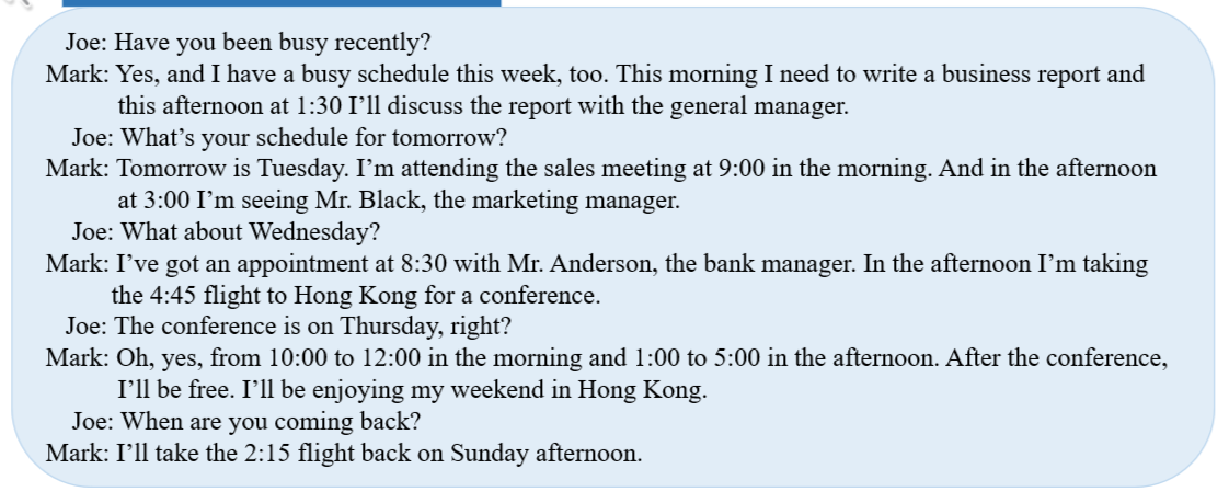 A: Well, I’ve got a meeting from 2:00 to 4:00. Are you free tomorrow morning?
