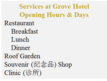 Grove Hotel provides a number of shops and restaurants and other services for your convenience. The restaurant on the ground floor serves breakfast, lunch and dinner. Breakfast is served from 6:30 a.m. to 9:00 a.m., lunch from 11:00 a.m. to 2:00 p.m. and dinner from 5:10 p.m. to 9:00 p.m. The restaurant is open every day of the week.