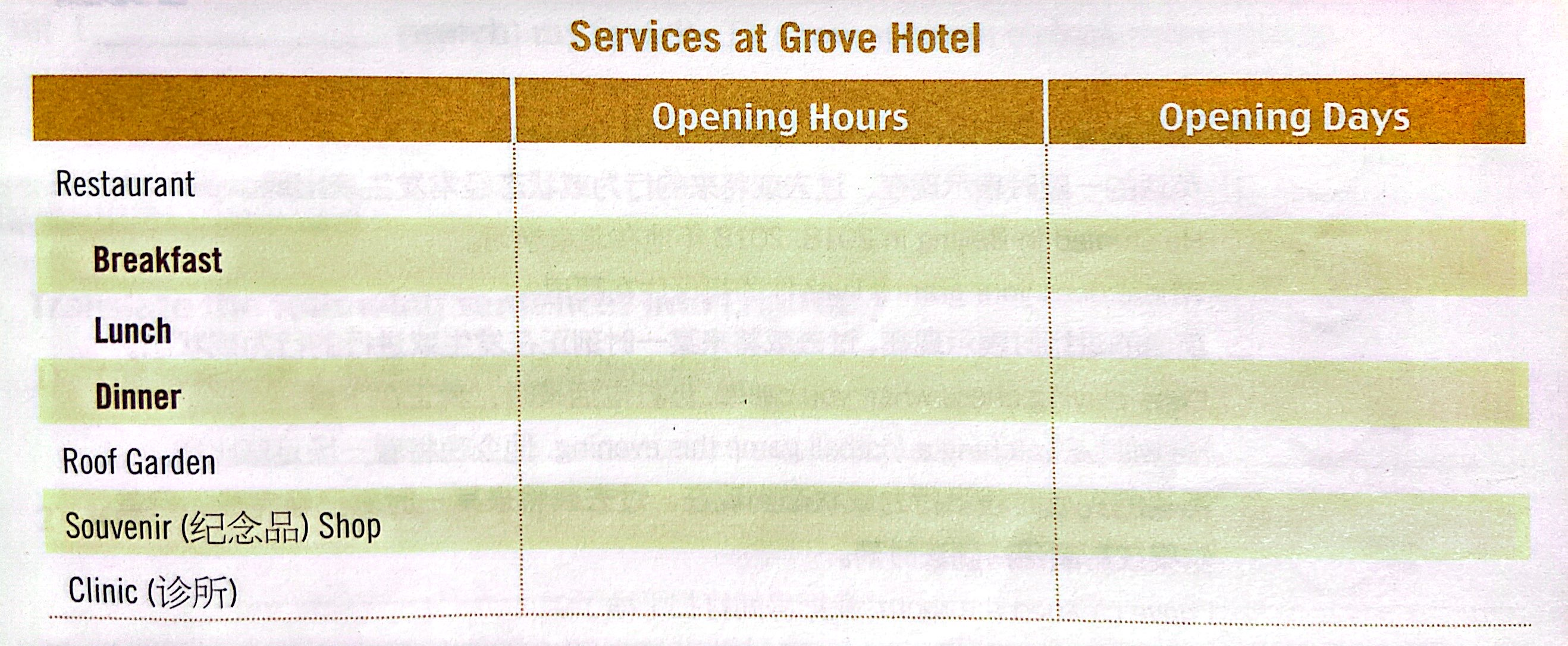 Medical (医疗的) service is offered at the clinic on the second floor. The opening hours of the clinic are from 8:00 a.m. to 12:00 at noon, 1:00 p.m. to 5:00 p.m. It is open from Monday to Saturday.