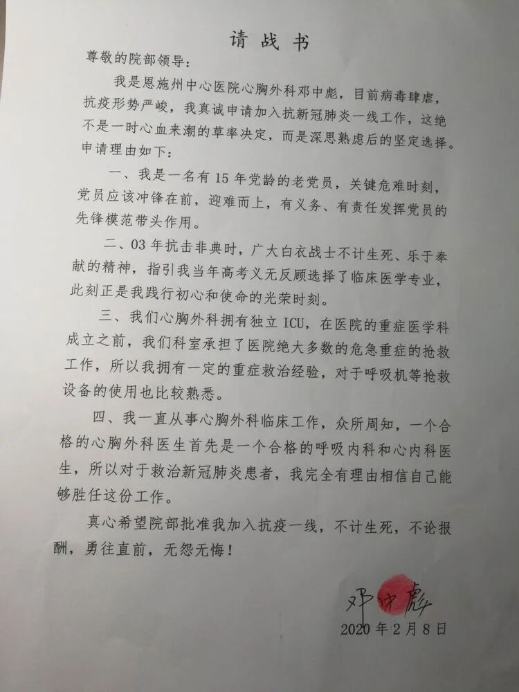 苟利国家生死以,岂因祸福避趋之,在这场没有硝烟的战斗打响的第一时间,在黄进启主任和张应琼护士长的带领下,科室全体成员向院部递交了请战书。我们没有对疫情产生恐慌,更没有对病毒产生丝毫畏惧,满脑子想的都是尽快进入一线,为“战疫”贡献心胸外科的一份力量。同时科室积极组织培训,系统学习新冠肺炎诊疗指南,全面掌握标准防护操作规范,为上一线时刻准备着。按院部安排,心胸外科邓中彪、蔡彦力、刘玮杰、尹绪碧四名医护人员作为第三梯队成员,在完成体检和院感培训后,于2月13日正式入驻感染科大楼,参与抗击新冠肺炎一线工作。我们主动申请进入四楼危重症ICU病区这个最危险的地方战斗。