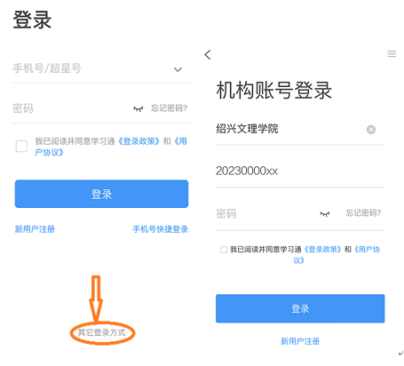 手机应用商店搜索并下载超星“学习通”APP,登录界面点击“其他登陆方式”进入机构账号登陆,单位名称“绍兴文理学院”,账号为自己的工号。初次登录可用手机号+验证码的方式,登录修改密码以后再用工号+密码的方式登录。显示密码错误的点击“忘记密码”用手机号找回。