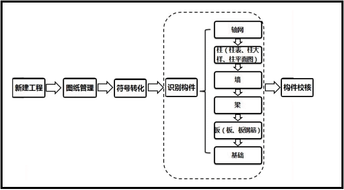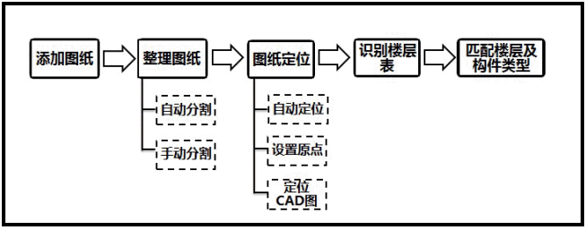 软件提供了功能强大、高效快捷的CAD识别功能,用户可将CAD“.dwg”电子图导入到软件中,利用软件提供的识别构件功能,快速将电子图纸中的信息识别为钢筋软件的各类构件。同时,软件还提供了完善的图纸管理功能,能够将原电子图进行有效管理,与钢筋工程的楼层及构件类型进行一一对应,并随工程统一保存,提高做工程的效率。识别操作流程图如下,让我们一起加入到CAD识别操作的演练中来吧。