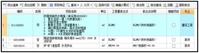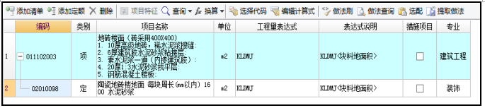 新建楼地面,名称为“地面2”,块料厚度为0;套取清单和定额,并选择工程量代码。