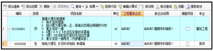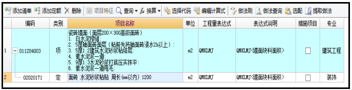 新建内墙面,名称为“内墙面2”,块料厚度为5;套取清单和定额,并选择工程量代码。