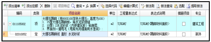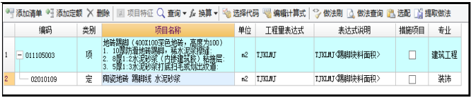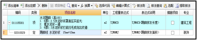 新建踢脚,名称为“踢脚2”,块料厚度为15,高度为100;套取清单和定额,并选择工程量代码。