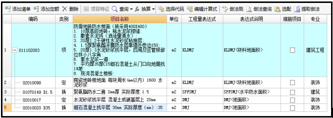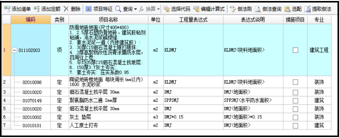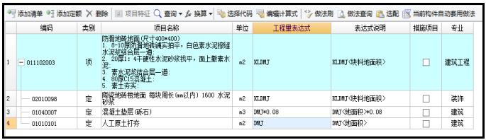 温馨提示:项目名称可以直接修改,例如直接把清单名称改为防滑地砖地面。另外混凝土垫层定额工程量的单位是计算体积,但楼地面的工程量代码中只有计算面积的代码。因为设计说明中指出做“地面1”混凝土垫层的厚度为80厚砼,那么我们可以直接使用(工程量代码*厚度,即DMJ*0.08)来求出混凝土垫层体积的工程量。特别指出工程量表达式是可以进行四则运算的,但是尽量少用加号或减号的运算方式。