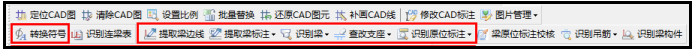 温馨提示:识别梁时若梁标注的钢筋级别符号已经是A、B、C、D之类的表示形式时,“①符号转换”步骤可以略去。提取梁标注可分为a自动提取梁标注,b提取梁集中标注,c提取梁原位标注;在提取时若使用a命令会把梁的集中标注和原位标注同时提取到软件中,软件会根据引线自动判断集中标注和原位标注;如果图纸不规范,集中标注和原位标注显示比较凌乱,导致软件不能智能区分梁标注中的集中标注和原位标注,则可以使用b和c命令来提取区分。识别梁可分为d自动识别梁,e点选识别梁,f框选识别梁;在实际工程中若需要瞬间把所有梁识别出来,可使用d命令,若要识别局部某些梁时,可选择e/f命令。识别原位标注可分为g自动识别梁原位标注,h框选识别梁原位标注,i单构件识别梁原位标注,j点选识别梁原位标注;g命令一次可把绘图区中所有梁的原位标注同时识别出来,h命令是把被选中的梁图元的原位标注识别出来,i命令一次只能识别一道梁的原位标注,h命令一次只能识别一道梁中的一个原位标注。