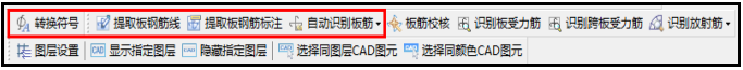 温馨提示:识别板筋时若板筋标注的钢筋级别符号已经是A、B、C、D之类的表现形式,“①符号转换”步可以略去。自动识别板筋时必须把柱、砼墙、梁、板构件全部绘制完毕。