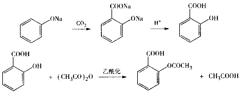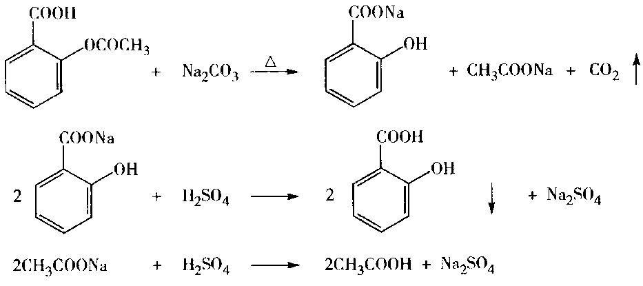 阿司匹林在碱性溶液中加热,水解生成水杨酸钠及醋酸钠,加稀硫酸后生成水杨酸和醋酸,水杨酸不溶于水而析出白色沉淀,醋酸具有特臭。