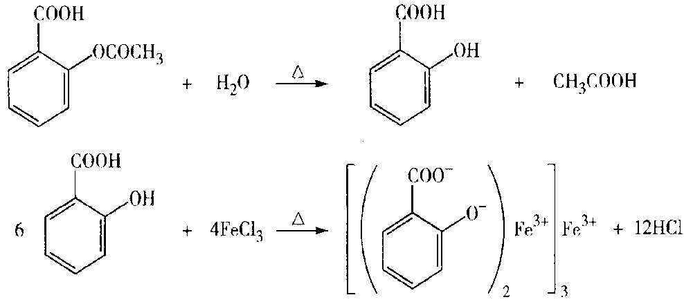 阿司匹林分子结构中无游离的酚羟基,不能直接与三氯化铁试液反应,酯键受热水解后生成水杨酸。水杨酸含有游离酚羟基,可在中性或弱酸性(pH值为4~6)条件下,与三氯化铁试液反应,生成紫堇色配位化合物。