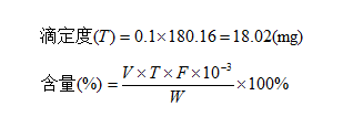 式中,V为滴定液的消耗体积(ml);T为滴定度;W为供试品的称样量(g);10-3为质量换算因数(1mg等于10-3g);F为滴定液的浓度校正因数。