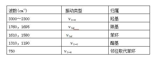3.红外光谱法  阿司匹林分子中含有羧基、酯基及邻位取代苯环,它们都可在红外光谱中产生特征吸收峰,峰的归属如下: