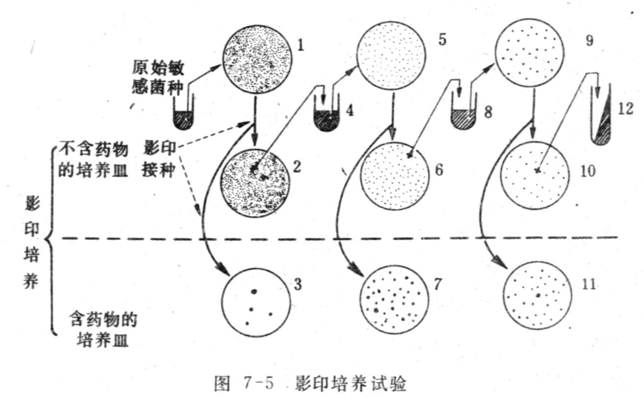 影印培养(replica plating)试验是1952年Lederberg夫妇设计的一种比波动实验更为巧妙的实验,直接证明了微生物的抗药性突变是自发产生,与相应的环境因素毫不相关的论点。