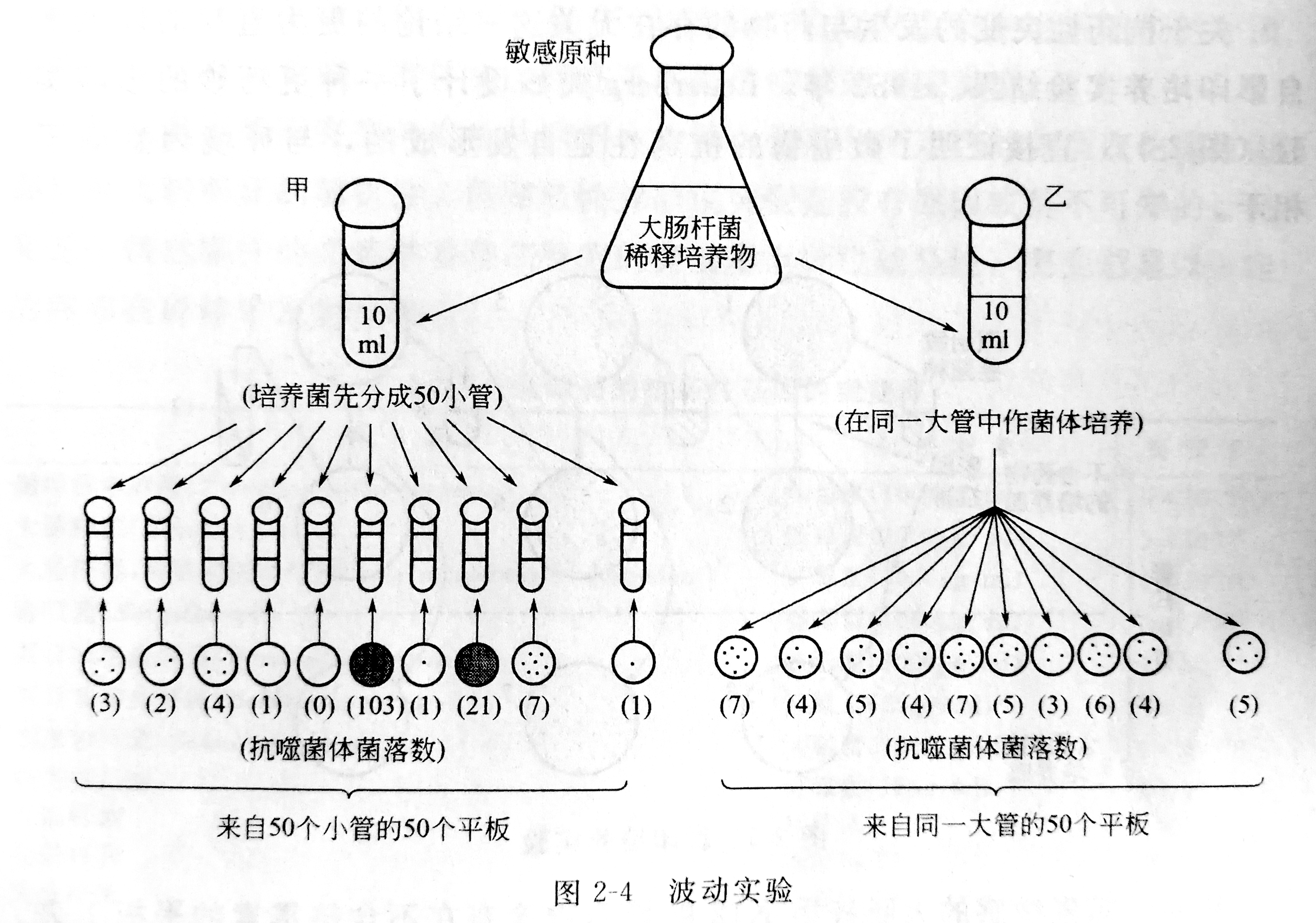此实验根据统计学原理设计:取对噬菌体敏感的大肠杆菌悬液分别装入甲、乙两只试管内,每管10毫升。甲管中的菌液再分装50支小试管中,每管0.2毫升,保温24~36小时,及时把各小管的菌液分别倒在涂有噬菌体的平板上,经培养后,对各平板上出现的抗噬菌体的菌落计数;乙管中的菌液不分装,先保温24~36小时后才分成50份,加到同样涂有噬菌体的平板上,培养后分别对各平板上出现的抗性菌落计数。