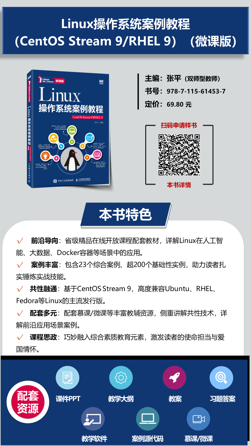 【2】张平, Linux操作系统案例教程(CentOS Stream 9/RHEL 9)(微课版),人民邮电出版社,2023,书号:978-7-115-61453-7