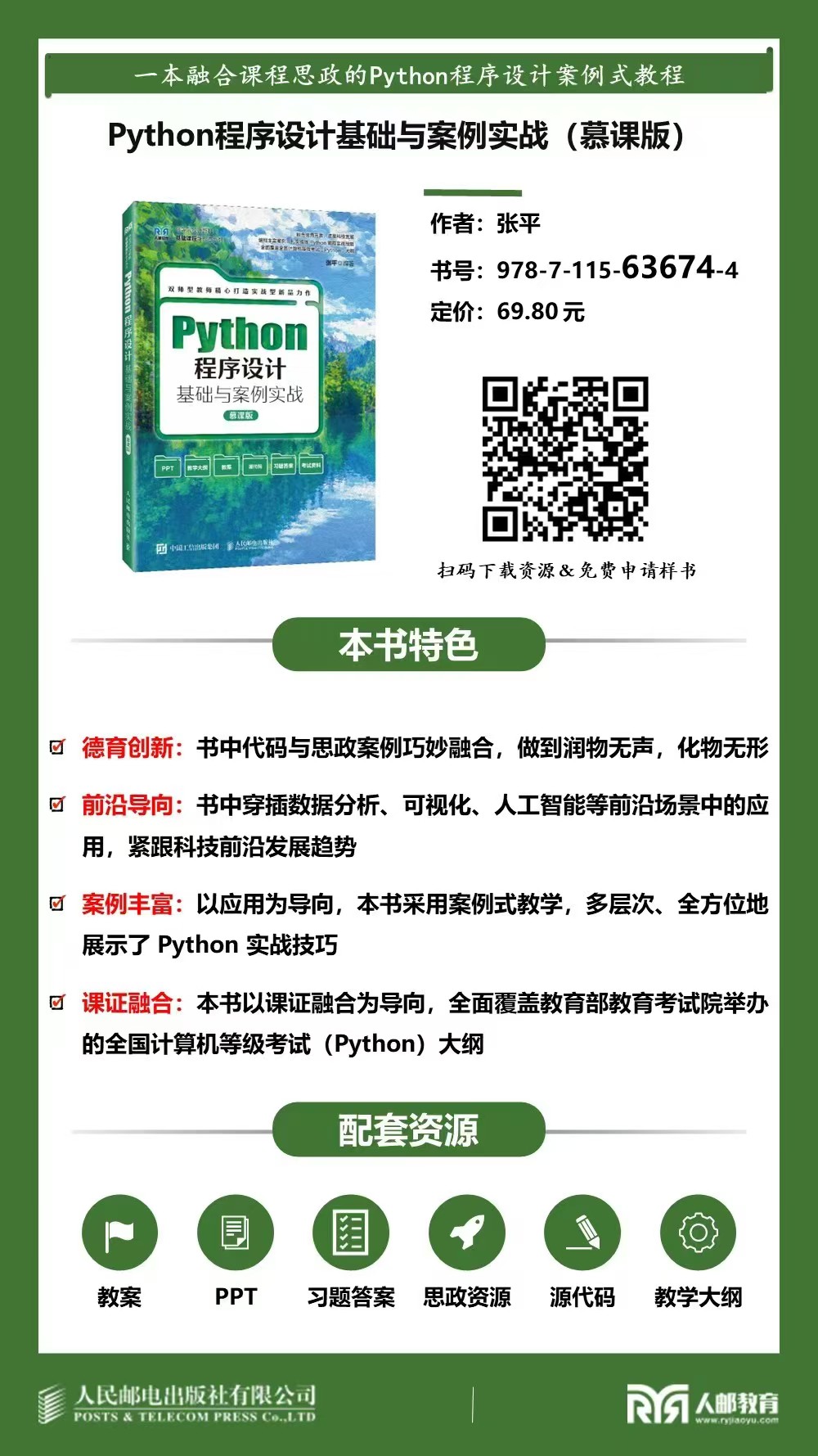 【配套教材】张 平,Python 程序设计基础与案例实战(慕课版),人民邮电出版社,2024,书号:978-7-115-63674-4