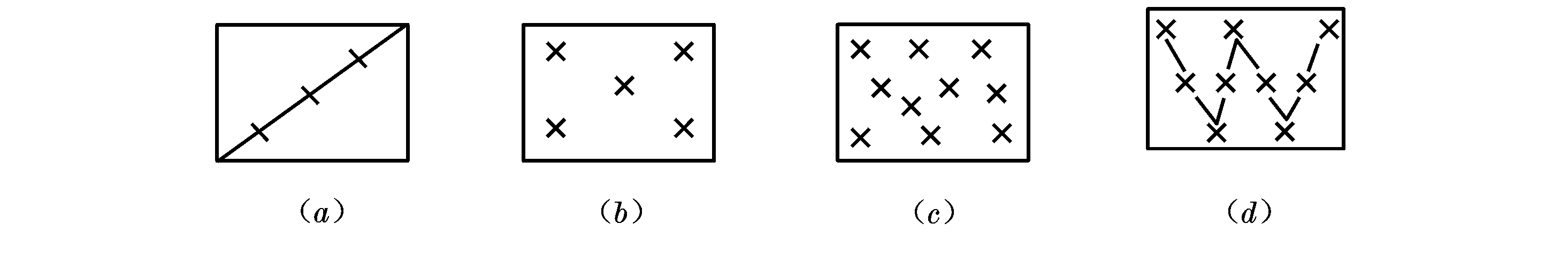 土壤采样点的布设既应尽量照顾到土壤的全面情况,又要视污染情况和监测目的而定。图1是几种常用采样布点方法:(a)对角线布点法适用于面积小、地势平坦的污水灌溉或受污染河水灌溉的田块。 (b)梅花形布点法适用于面积较小、地势平坦、土壤较均匀的田块。(c)棋盘式布点法适用于中等面积、地势平坦、地形完整开阔、但土壤较不均匀的田块。(d)蛇形布点法适用于面积较大,地势不很平坦,土壤不够均匀的田块。图中记号“×”作为采样点。