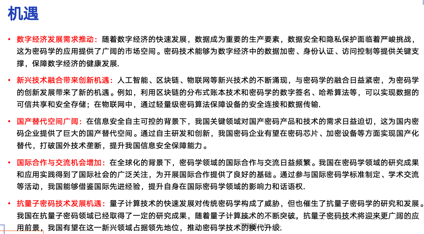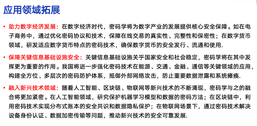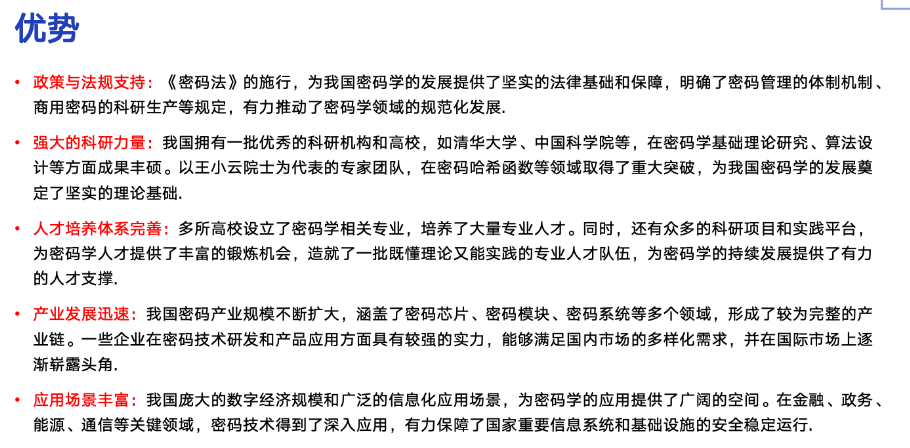 密码发展对我国具有重要意义,不仅关乎国家安全、经济社会发展、个人隐私保护等多个方面,还能推动科技创新与人才培养以及提升国际竞争力。因此,我们应该高度重视密码技术的发展和应用,加强相关领域的合作与交流,共同推动密码技术的不断进步和创新。