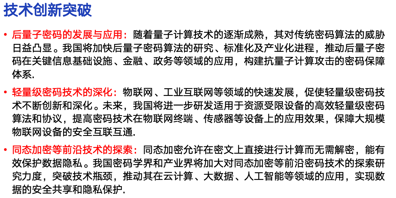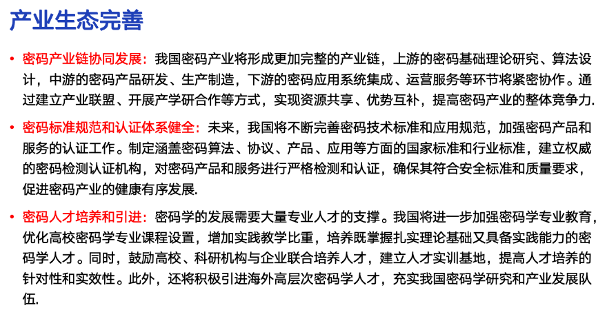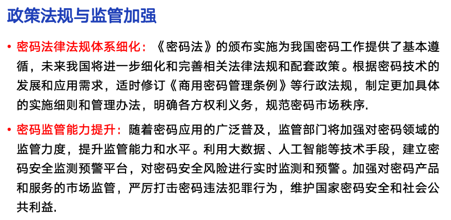 发展趋势:探讨从技术创新突破、应用领域拓展、产业生态完善、政策法规与监管加强四个层面简述未来密码学技术的未来发展。
