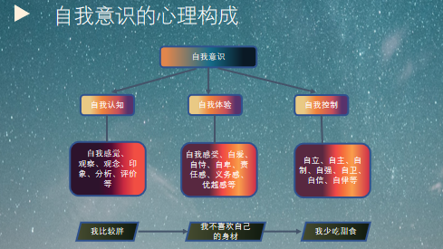 ②自我体验——属于情绪范畴,以情绪体验的形式表现出人对自己的态度。主要是人的自我感受,以自尊、自爱、自信、自卑、自怜、自弃、自恃、自傲、责任感、义务感、优越感等表现出来。